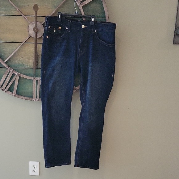 | Characteristics of goods | Used pictures taken of approx measurements I think the wash is Last Call Experience the timeless appeal of True Religion's blue straight jeans, crafted in a classic style. These jeans offer a clean, uniform indigo wash that embodies the essence of traditional denim. With their full-length cut and straightforward design, they provide a versatile and enduring wardrobe staple. | ||
