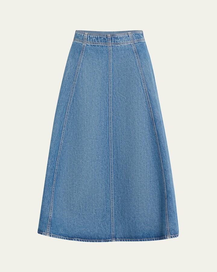 | Characteristics of goods | Details: Ulla Johnson "The Uma" midi skirt in mediumwash denim High rise Elastic waistband Circlecut silhouette Hem falls below the knee Pullon style Cotton Machine wash cold Made in USA | ||
